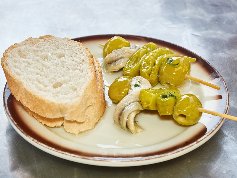 "Pintxo" originates from the Spanish word "pinchar," meaning to pierce or spike. Historically, pintxos were simple slices of bread topped with ingredients like anchovies, olives, or cheese, secured with a toothpick. They were originally served as a snack to accompany drinks at local bars.